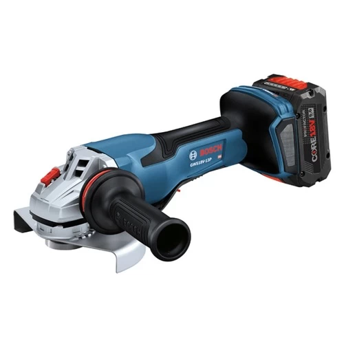 The Bosch GWS18V-13P 18V 5 – 6 in. Angle Grinder with Slide Switch delivers the ultimate combination of performance, control and power in a cordless grinder. This tool is part of the PROFACTOR System, which pairs BITURBO Brushless Technology with a CORE18V High Power Battery. BITURBO Brushless Technology is a high-performance motor and drivetrain system designed to deliver power comparable to high-demand corded tools. The grinder includes KickBack Control, which helps shut off the tool if the wheel gets into a bind situation. It also has restart protection to help prevent accidental tool startup if the supply of power is interrupted. It also includes advanced electronics such as constant electronics and overload protection. The grinder includes a brake system, which helps provide a rapid stop of the wheel when the switch is turned off, and a multi-grip paddle switch, which provides increased grip options for better comfort and control. It features spiral bevel gears for smooth transmission of power, a 2-position Vibration Control side handle, an adjustable tool-free guard, and a slim soft-grip design for additional grip ergonomics. The kit includes a CORE18V 8 Ah High Power Battery, which delivers 50 percent more runtime and over 75 percent more power than the CORE18V 4 Ah battery, powering high-demand applications.