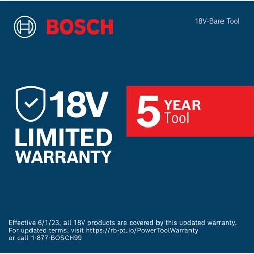 Bosch 18V Cordless power tools are covered by a 5-year limited warranty. For details, visit https://rb-pt.io/PowerToolWarranty or call 1-877-BOSCH99.