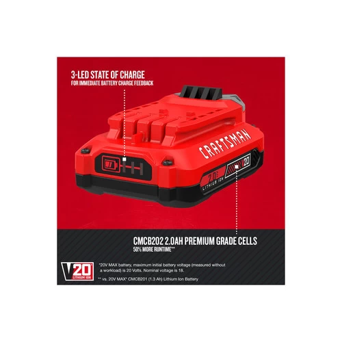 This 20V 2 Ah Lithium-Ion Battery pack provides up to 1.5X the runtime of a standard 20V MAX Lithium-Ion Battery. It is compatible with all the CRAFTSMAN 20V Cordless power tool and outdoor tool lineup. The professional grade high performance cells provide improved power and a longer cycle life. Each pack is equipped with a 3-LED state of charge for immediate battery charge feedback. No memory and virtually no self-discharge means this battery is ready when you are.