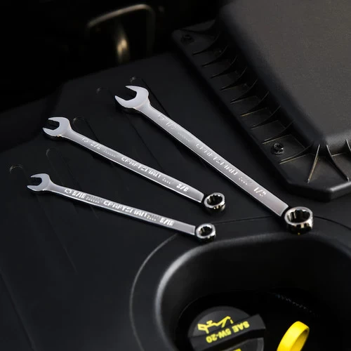 Includes (7) Long Panel Gunmetal Chrome Combination Wrenches SAE (3/8-in., 7/16-in., 1/2-in., 9/16-in., 5/8-in., 11/16-in., 3/4-in.)