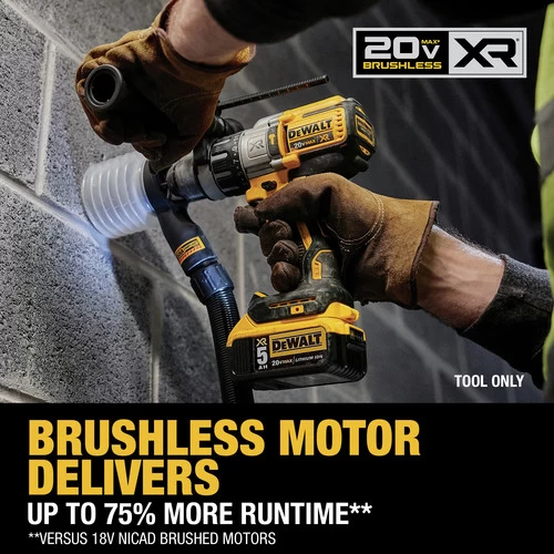 With a high power, high efficiency brushless motor, the 20V MAX XR Brushless Lithium-Ion 1/2 in. Cordless 3-Speed Hammer Drill/Driver (Tool Only) delivers up to 57% more run time over tools with brushed motors. Compatible with XR Lithium-Ion batteries (sold separately), this unit can provide 33% more capacity over standard packs.