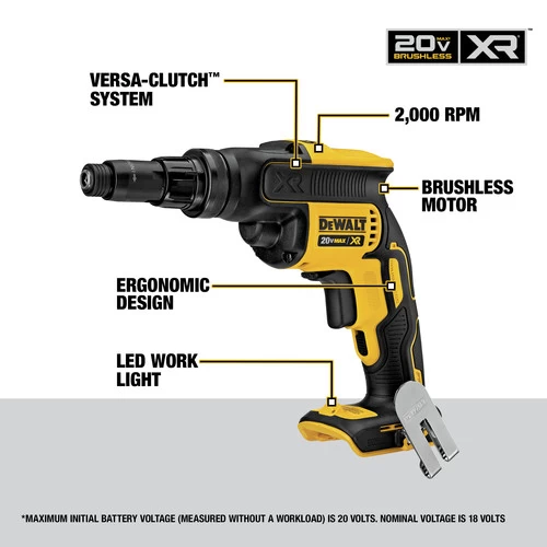 The DEWALT 20V MAX DCF622 Screwgun with Versa-Clutch features a DEWALT built brushless motor capable of up to 2000 RPMs delivering the torque needed for heavier duty fastening applications.