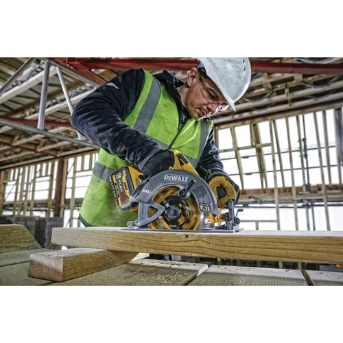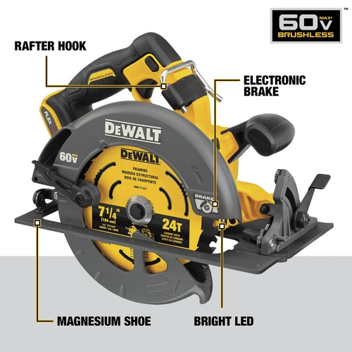 Add power to your tool collection with the FLEXVOLT 60V MAX 7-1/4 in. Cordless Circular Saw with Electric Brake. It has up to 47 percent more power than the DCS575 60V MAX Circular Saw with 2,456 UWO. With a no-load speed of 5,800 RPM, this saw delivers the power of a corded circular saw with the portability and convenience of cordless through revolutionary DEWALT FLEXVOLT technology.