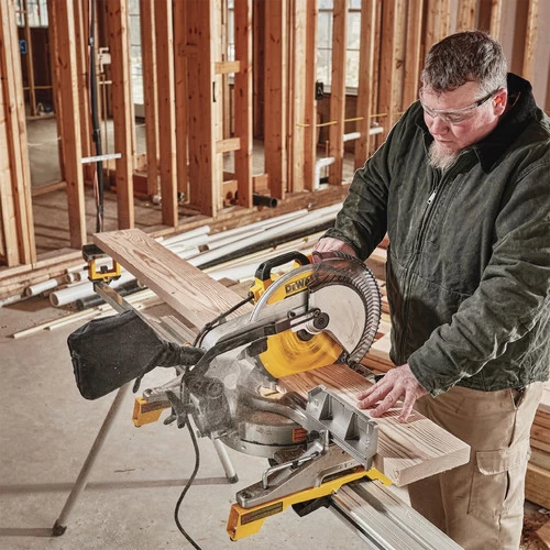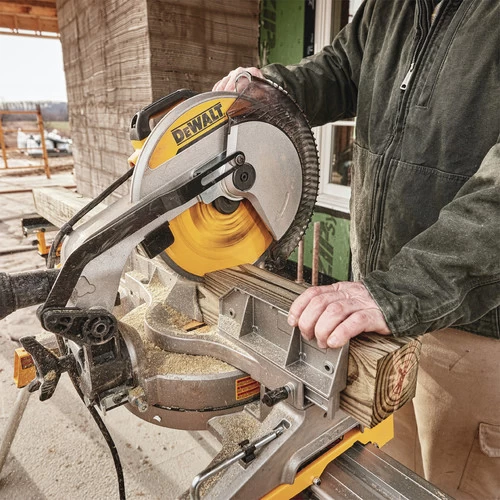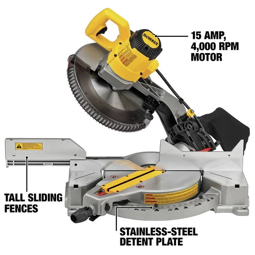 The DW715 12 in. Single-Bevel Compound Miter Saw is powered by a 15 Amp motor to drive 4,000 RPM, delivering extended power and durability. Features stainless steel miter detent plate and cam miter lock that provide repeatable accuracy and durability with easy adjustments. Tall sliding fences support 5-1/2 in. of base molding vertically and 5-1/2 in. of crown molding vertically nested. Lightweight design and built-in carry handle for portability.