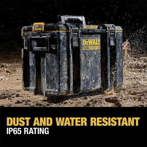The ToughSystem 2.0 Extra Large Toolbox has patented auto-connect side latches, allowing for one-hand operation. It also has 2-piece metal front latches for added durability when securing tools inside the box. It is IP65 rated for dust and water resistance and has a 110 lbs. load capacity. The toolbox has a removable inner tray for optimal organization. The ToughSystem 2.0 Extra Large Toolbox is backwards compatible with any ToughSystem product.