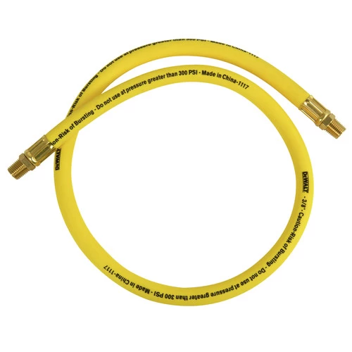 Connect this DEWALT 3/8 in. x 3 ft. Premium Hybrid Whip Hose to any air hose for 3 ft. of added length and to prevent hose entanglement when working with air tools. This whip hose provides more flexibility for use in cramped engine compartments and other hard-to-reach spaces where maneuverability is limited. The hose is oil resistant with solid brass 1/4 in. NPT male end fittings which never corrode and bend restrictors that prevent kinking and tangles. The DEWALT 3/8 in. x 3 ft. Premium Hybrid Whip Hose is the perfect accessory for any air tool and any air compressor that operates at 300 PSI or less.