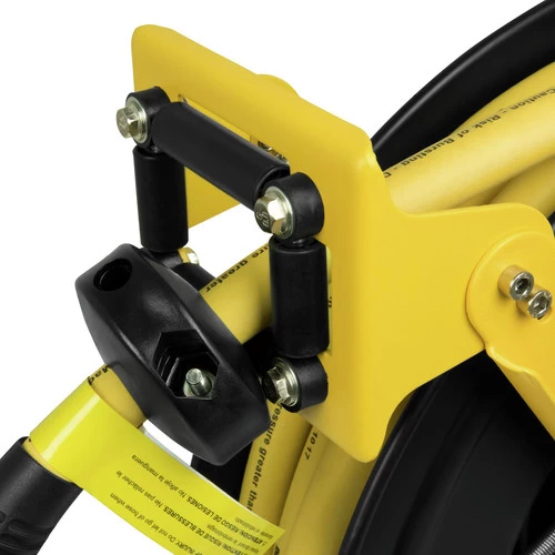 The DEWALT 1/2 in. x 50 ft. Double Arm Hose Reel is suitable for industrial, contractor, or household use. The spring-powered drive feature makes hose retraction quick, automatic, and easy. The 12 position ratchet gearing lock allows for the hose to be pulled to any length. With the self-leveling system, the hose can be wound up easily. The dual-arm and professional grade all-steel construction is very strong and reliable. The hose guide uses a 4-roller design to help reduce hose wear.