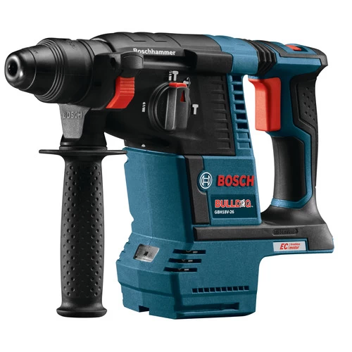 The Bosch GBH18V-26 18V EC Brushless 1 In. SDS-plus Bulldog Rotary Hammer provides similar impact to corded hammers – with cordless convenience. The hammer features an efficient EC Brushless motor, for 50 percent more impact energy and greater tool runtime than conventional cordless hammers. It includes advanced Bosch technology, such as KickBack Control, Electronic Precision Control and Vibration Control. At only 6.3 lbs., this Bulldog delivers 1.9 ft-lbs. of impact energy, for an outstanding impact-to-weight ratio.