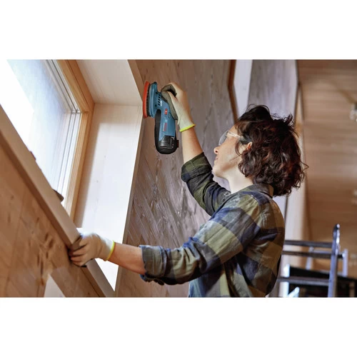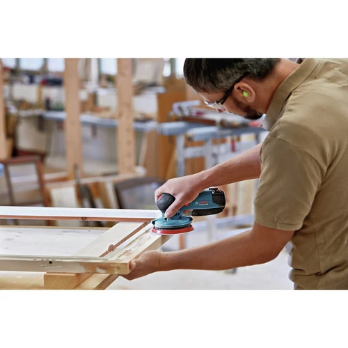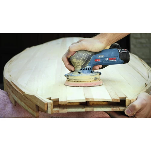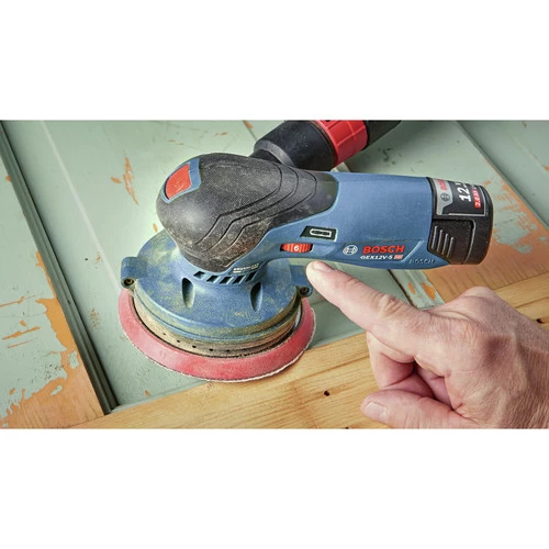 This 12V Max random orbit sander is designed to tackle hard-to-reach work areas with power and control. It features a well-balanced ergonomic palm grip, which allows your hand to be closest to the work material to avoid tilting and pressing down, for best results. The easy-to-reach on/off switch offers intuitive operation. The Bosch GEX12V-5N-RT Brushless 5 in. Random Orbit Sander has a powerful 12V Max brushless motor, and it is engineered for professional applications. The speed selector delivers best results in different materials and applications. The sander has a 5 in. 8-hole sanding pad, which provides optimal dust collection when the sander is attached to a vacuum or a dust bag. The dust pad is ideal for both flat and concave/convex surfaces. The included dust bag allows mobile dust collection, while the tool has an interface for vacuum hose attachment. It also has soft-start technology, constant speed and a hook-and-loop backing pad. The sander has a compact shape with close-to-the-workpiece design for control in hard-to-reach areas.