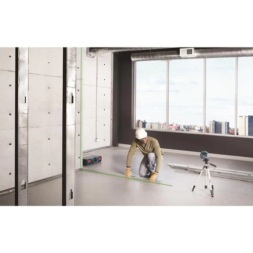 The Bosch GLL 100 GX Self-Leveling Cross Line Laser package delivers a laser with all-in-one versatility, providing high visibility line and points that can be turned on independently or together for horizontal leveling, vertical leveling and plumb transfer applications. The GLL 100 GX features a visible working range of 100 ft. with the high-visibility green laser beam.