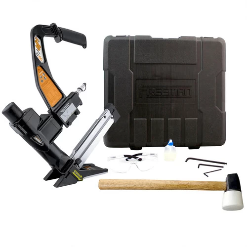 The Freeman PFL618BR 3-in-1 15.5/16-Gauge 2 in. Flooring Nailer/Stapler shoots both 15.5-Gauge 1/2 in. staples and 16-Gauge 1-1/2 – 2 in. T and L cleats without changing anything on the gun. The body of this gun is constructed of durable die-cast aluminum for job site dependability for daily use. It comes with a mallet and two composite non-marring base plates for added stability and protection against scratches to the flooring surface that allow you to install 1/2-3/4 in. solid hardwood flooring. Additionally, the PFL618BR features an anodized aluminum rail for added durability, an air filter and dust cap to keep internal parts clean for increased longevity, and a one-piece drive that eliminates an internal fail point during extensive use. Freeman combines affordable pricing with high quality products for the ultimate value in a tool.