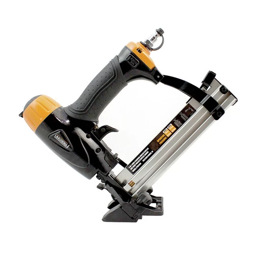 The Freeman Pneumatic Ultimate Flooring Nailer Kit contains everything you need to get the job done. Featuring two multipurpose guns, this kit can tackle just about any flooring project you can throw at it from beginning to end. The 3-in-1 Flooring Nailer and Stapler shoots both 16-Gauge T cleats and L cleats and 15.5-Gauge staples. This nailer features 2 interchangeable base plates that provide stability and protect flooring surfaces from scratches. The body of the nailer is constructed of durable die-cast aluminum to stand up to daily use, while the driver blade is made of hardened steel with an aluminum cylinder and high-quality rubber O-rings. The 3-in-1 comes with wrenches, oil, and a long reach fiberglass mallet with a padded grip. The 4-in-1 Mini Flooring Nailer and Stapler offers a convenient design that can be used as either a 45-degree brad/staple gun or 90-degree 18-Gauge straight brad/staple gun. It features a 360-degree adjustable exhaust that helps keep surfaces clean, tool-free depth-of-drive adjustment and an oil-free, low maintenance motor. It is ergonomically engineered for user comfort. The PFBC940 is recommended for use on 1/4 to 1/2 in. solid or engineered flooring.