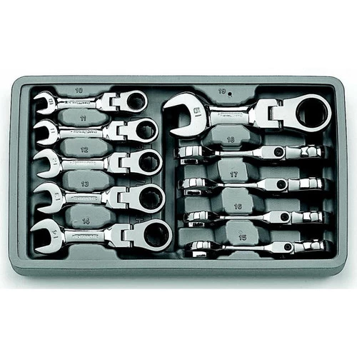 The GearWrench 9550 10-Piece 12-Point Metric Stubby Flex Combo Ratcheting Wrench Set allows you access to tight areas that a standard wrench will not. Its Surface Drive technology provides a stronger grip around fasteners. With only a 5 degree requirement to fasten or loosen bolts, this wrench beats out the competition in efficiency and comfort.