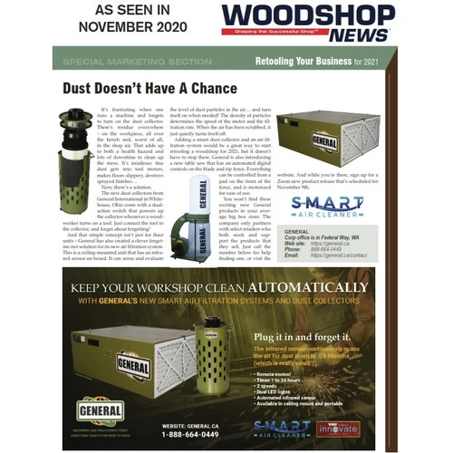 This General Dust Collector is a high quality collector that will meet your dust management needs and applications. Simply plug your tool into the DC and the DC will turn on and off with the tool. Designed for Industrial applications with a continuous duty rating. The motor is totally enclosed, fan cooled and permanently lubricated. Intake screen prevents larger pieces from jamming in the impeller. Innovatively designed to be portable and mobile on four heavy duty swivel casters. It’s user friendly and can move around your shop at great ease. Quick-release bag clamp with metal strap. The Safety lock-out switch with removable key, helps prevent unauthorized use. Spark resistant high impact fiberglass reinforced impeller for smooth operation and minimal noise. Includes reusable clear plastic collector bag and washable, extra fine 2 micron filter bag. 6-5/32 in. static pressure of water without bag. Electrical Testing Laboratory CERTIFIED (ETL). Limited 3 year warranty extendable to 5 year if registered at www.general.ca