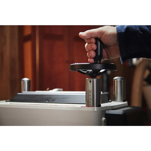Large hand wheel with positive gear drive easily moves the head to the desired board thickness