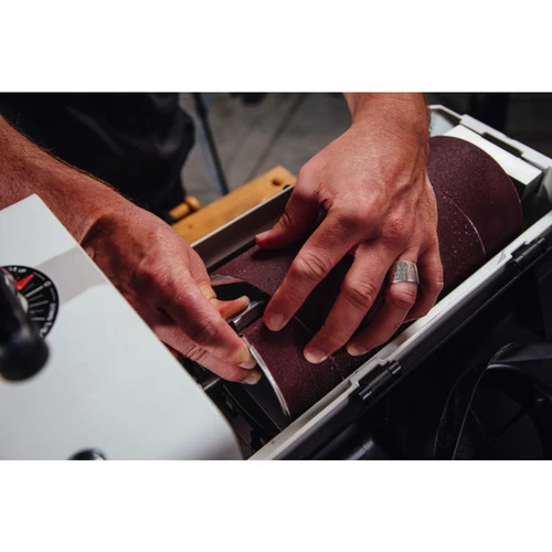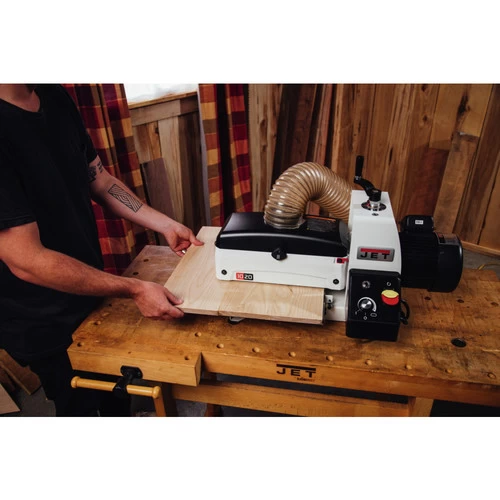 The compact JWDS-1020 Benchtop Sander from Jet packs a powerful 1 HP motor that will sand boards up to 3 in. thick and 20 in. wide. The innovative patented dust hood ensures dust is funneled to the 4 in. dust port that easily connects to a dust collector. Adjusting the table back to parallel is convenient with just the turn of a dial. The self-cooling extruded aluminum sanding drum protects the sanding surface from heat damage, preventing waste.
