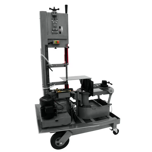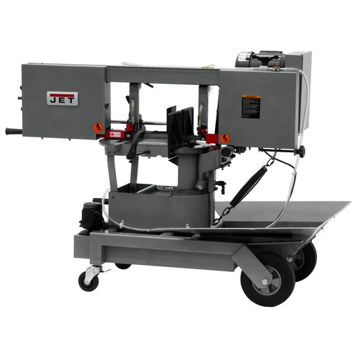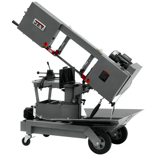 The JET Dual-Mitering band saw offers versatility and ease. The unique head design miters both left and right, allowing for quick angle cuts. Add to the convenience with easy conversion from a horizontal to vertical position, and wheels for moving around the shop floor.