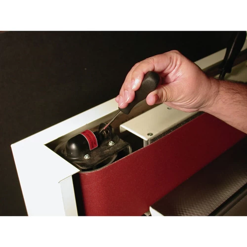 Quick-release lever and tracking control dial are conveniently located for replacing and tracking belts