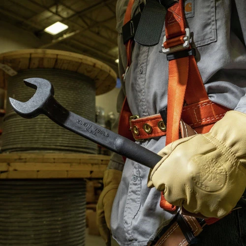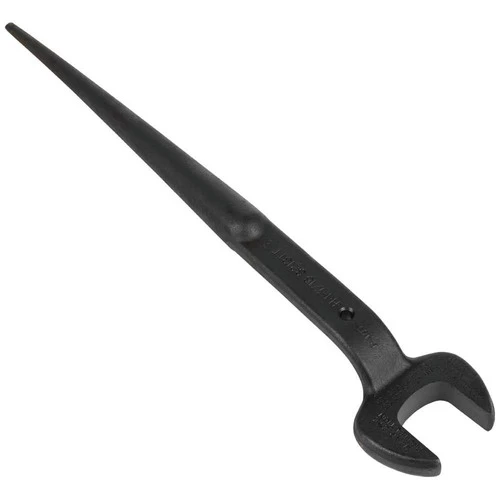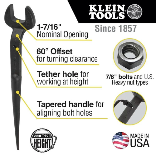 Forged from select alloy steel, Klein Tools’ 1-7/16 in. Nominal Opening Spud Wrench is designed to withstand high-leverage and heavy loads. For use with 7/8 in. bolts and U.S. heavy nut types, the extra heavy-duty head area provides maximum strength and durability. Plus, the continuous taper of the handle makes it easy to line up bolt holes. Includes a built-in hole so tool can be tethered when working at height.