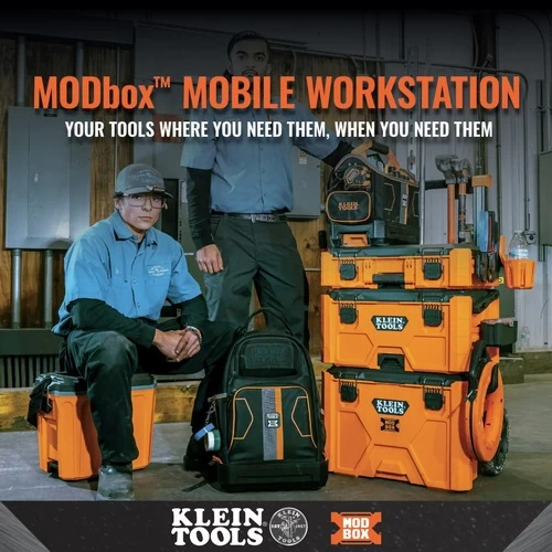 Klein’s Tool Tote features 33 pockets for plenty of tool storage, including a tape loop and a zipper side pocket to store loose parts. Built-in technology to seamlessly connect to Klein’s MODbox Mobile Workstation and other MODbox components to make a custom mobile workstation.