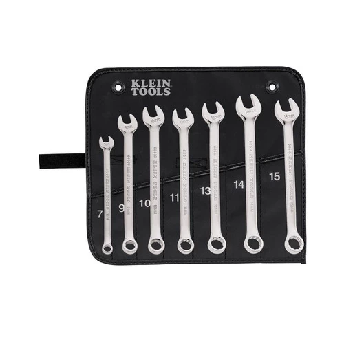 This Klein Tools 7-Piece Combination Metric Wrench Set includes 7 of the most popular metric wrench sizes. Each wrench has an open-end and a box wrench, both with the same size opening. This set also comes with a pouch that has marked pockets for each wrench and hanging grommets.