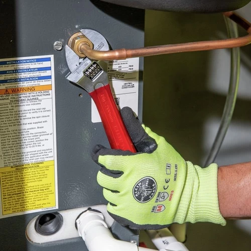The Klein Tools adjustable wrench is designed with smaller size but the ability to handle heavy-duty jobs. This wrench is manufactured from heat-treated alloy steel for strength and has a high polish chrome finish. It also features a lightweight 8 in. design with an extra-capacity jaw.