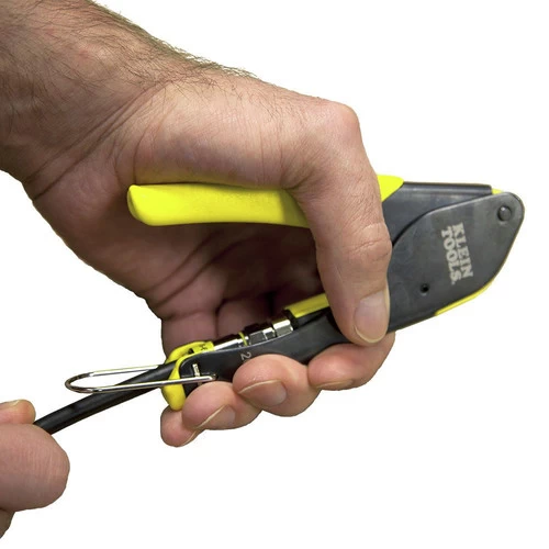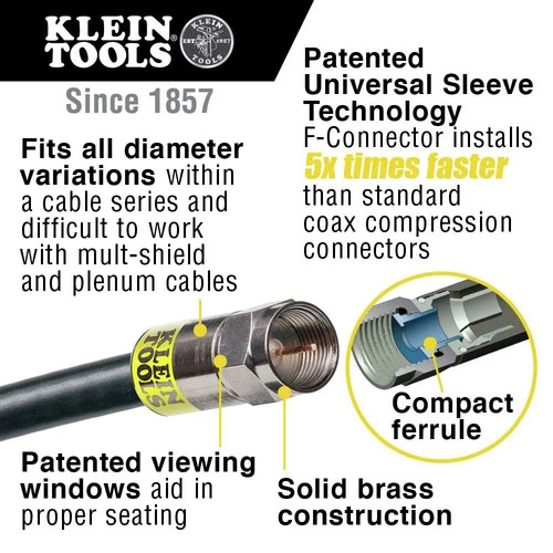 The Klein Tools Coax Installation Kit has the tools you need to prepare and connect coaxial cables with F-connectors. This kit includes a Klein Tools compact compression crimper, a 2-Level radial stripper, a multi-cable cutter, and 6 F-connectors. It also comes with a custom zipper bag.