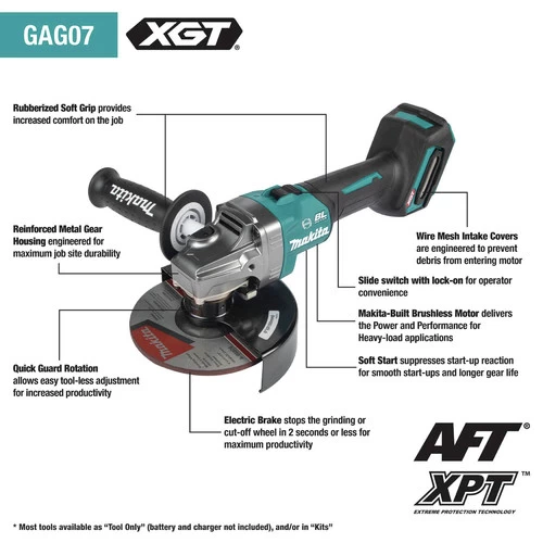 The 40V max XGT Brushless Cordless 6 in. Angle Grinder with Electric Brake (GAG07Z, tool only) delivers corded grinding performance without the cord for the most demanding applications. It is ideal for grinding and cutting a wide range of materials including tile, concrete, pipe, conduit, and more. An electric current limiter helps protect the motor from overload in high-torque applications. Additional features include an electric brake that stops the grinding or cut-off wheel in 2 seconds or less and Active Feedback-sensing Technology (AFT) that turns the motor off if rotation of the wheel is forced to a stop. The angle grinder has a slide switch with lock-on for convenience. Anti-restart protection is engineered to prevent motor start-up when the battery is inserted while the switch is locked on. A soft start suppresses start-up reaction and provides smooth start-ups. Wire mesh intake covers are engineered to prevent debris from entering the motor. The GAG07Z is also equipped with Makita’s Extreme Protection Technology (XPT), a series of protective seals inside the tool. XPT is designed to improve a tool’s operation in harsh conditions by channeling water and dust from key internal components. Reinforced metal gear housing provides additional durability on the job site. XGT is a system of equipment, tools, batteries and chargers utilizing 40V max Lithium-Ion batteries. XGT is engineered to deliver high power to take on high-demand applications, allowing users to completely transition to a cordless job site. XGT is equipped with advanced brushless motor engineering, intelligent digital communication, and superior durability features to outpower, outsmart and outlast the rest.