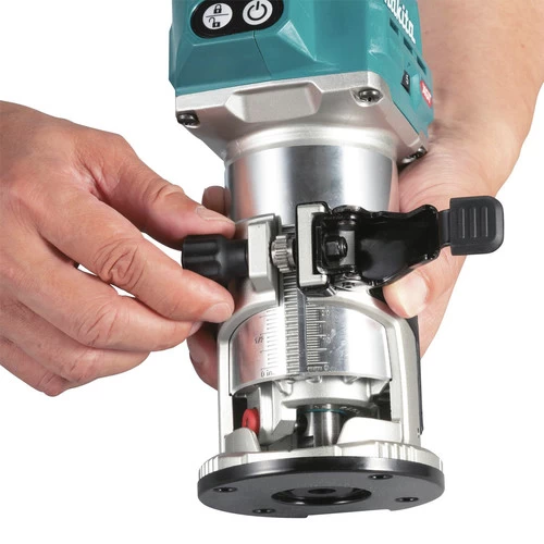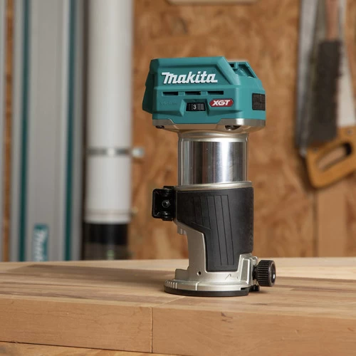 The 40V max XGT Brushless Compact Router provides a cordless solution for many woodworking needs. The electronically controlled Makita-built brushless motor delivers up to 1.5 HP and efficiently uses energy to match torque and RPM to the changing demands of the application. It has a variable speed control dial (10000 – 31000 RPM) to match the speed of the application, and electronic speed control engineered to maintain constant speed under load. Convenience features include the soft start feature for smoother start-ups and better accuracy, dual L.E.D lights to illuminate the workspace, and an on/off button with a separate lock button. The slim and ergonomically designed body with a rubberized grip is engineered for increased comfort. The Router has a quick-release cam lock system for convenient depth adjustments and easy base removal/installation when installing other bases. For increased versatility, it accepts the industry-standard template guides. It’s equipped with XPT for increased dust and water resistance in harsh job site conditions.