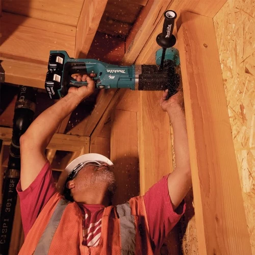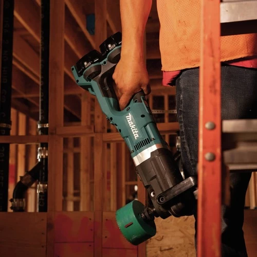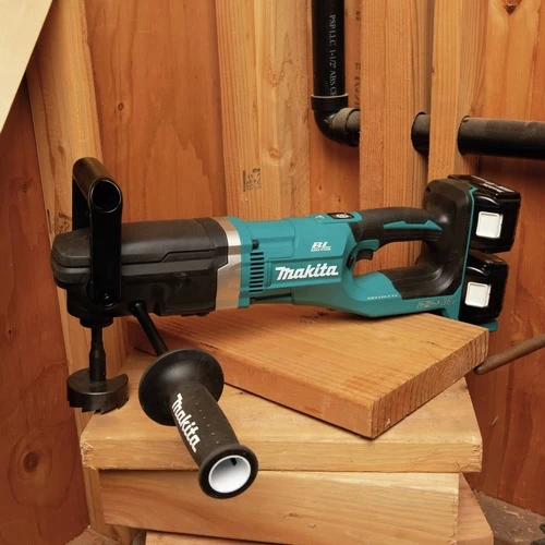 Makita, a pioneer in brushless motor technology and battery innovation, combines both in the 36V (18V X2) LXT Brushless 7/16 in. Right Angle Drill. It’s powered by two 18V LXT batteries for maximum performance and has an electronically controlled BL Brushless motor that matches torque and RPM to the changing demands of the application. Makita 18V X2 means freedom from the cord, and the XAD04 will take on the most demanding applications like drilling up to 6-1/4 in. Holes with hole saws and 4-5/8 in. Holes with self-feed bits. Best of all, users can remain in one battery platform, using the same fast-charging 18V LXT batteries with the XAD04 as they use across the expansive Makita LXT cordless system. The XAD04 has a long list of features for drilling with superior speed and efficiency. The Makita BL Brushless Motor combined with X2 LXT technology delivers with a variable 2-Speed design (0 – 350 RPM and 0 – 1400 RPM) for optimum speed control and drilling versatility. Under load, the Automatic Speed Change technology adjusts drill speed and torque during drilling for optimum performance. Added features include an electric brake for maximum productivity and a built-in clutch that reduces gear damage by disengaging gears if the bit binds (low speed only). It’s powered by (2) 18V LXT batteries for maximum power, speed, and run time without the hassles of a cord. The XAD04 can drill up to 160 2-9/16 in. Holes per charge in 2X SPF using (2) 5 Ah Batteries and a self-feed bit (self-feed bit sold separately).