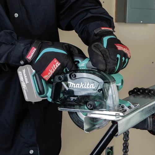 The XSC03Z features a transparent chip collector box which captures debris produced while cutting and provides needed visibility in determining need for disposal. Additional features include a trigger switch with two stage lock-off requiring two actions to power the saw and an electric brake allowing the tool to be repositioned for maximum productivity. Makita offers four optimum 5-3/8 in. blade options for use with the XSC03Z: 30T carbide tipped for metal and general purpose; 50T for thin metal; 50T for aluminum; and 56T for stainless steel (all sold separately).