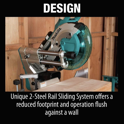 Unique 2-Steel Rail Sliding System design offers single slide-glide operation; reduced saw footprint allows operation flush against a wall