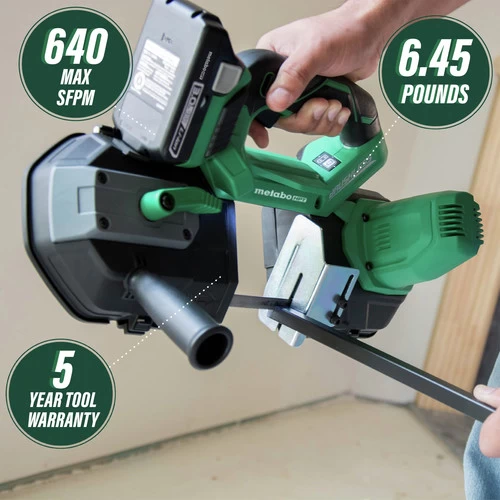 Covered by Metabo HPT Lifetime Lithium-Ion tool warranty and equipped with a Brushless motor technology, the CB18DBLP4 (tool body only) is a cordless band saw with a 3-1/4 in. cut capacity. It is designed to cut in place, overhead or in hard to reach spaces materials like conduit pipes, steel pipes, power cables, aluminum window frames and various plastics. Impressively lightweight at 6.45 lbs (without battery), this cordless band saw features an on-tool battery charge indicator, an auto-mode function to automatically adjust the blade speed to the application and has a convenient tool less blade change to reduce user downtime. Available as a tool body only, this Brushless Band Saw is compatible with all Metabo HPT 18V Lithium-Ion slide-type batteries.