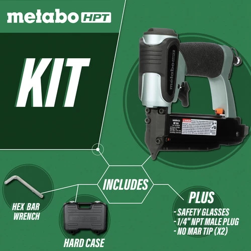 Metabo HPT 1-3/8 in. 23-Gauge Micro Pin Nailer offers an excellent finishing solution for tasks such as trim work or cabinetry. Conveniently lightweight and compact, it fires 23-Gauge headless pins, producing near invisible holes. The magazine automatically adjusts to 5/8-in, 3/4 in, 1 in, 1-3/16 in. and 1-3/8 in. fastener lengths so you can use it on a number of projects, and it has a removable nose plate for easy jam clearing. Its large housing shield, no mar tips and rear exhaust protect delicate work surfaces from damage, and it has a dual trigger for safe and accurate placement of fasteners. It also has a reload indicator to let you know when you’re running low on nails to avoid dry firing.