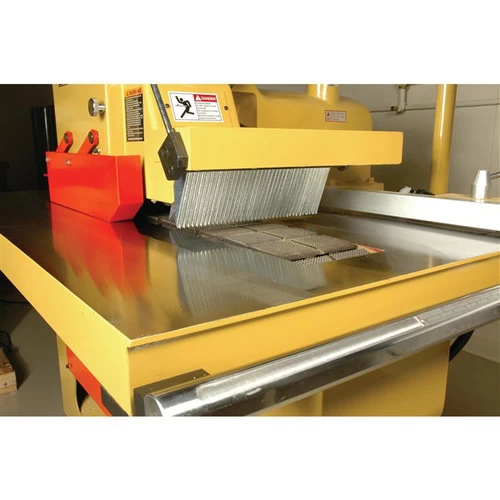 Whether it is face frames, long runs or full production, the SLR12 Straight Line Rip Saw has every job covered. Powered by a 15 HP main motor, this saw has the capacity for virtually any job. The 12 in. main blade mounts on a high-alloy, heat-treated arbor that is precision-ground and dynamically balanced for maximum stability and long durability. Exclusive to Powermatic, a series of seven stock hold-downs keep each workpiece flat and straight throughout the cutting cycle. Controls for rip width, cutting depth, and main and feed motors are all mounted up front for fast job changes. The large cast-iron table surface supports any size stock and the efficient dust collection port ensures a clean work area.