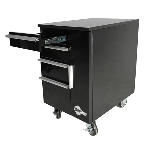Heavy-duty welded steel construction. 4 locking, swivel casters for easy mobility. Smooth, slow-close drawer slides. 18 in. W x 25.25 in. D x 29 in. H
