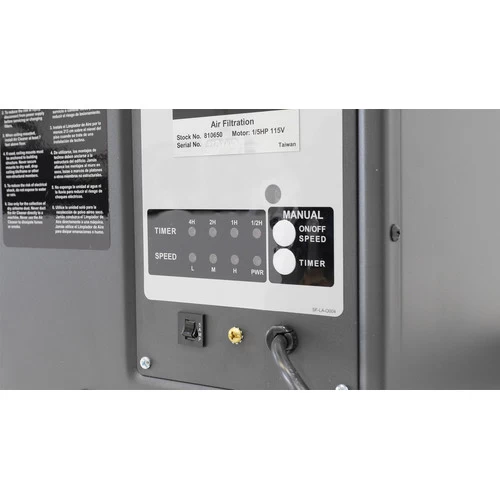 Timer settings from 1/2 hour to 4 hours allow user to set the unit with confidence that, while they are away, the unit will clean the air in the shop and then turn itself off. Inner filter captures all particles larger than 1 micron ensuring clean air output. Includes a 1/5 HP, 60 Hz, 120 V, 1 Phase motor, 4 eye bolts and a flange nuts for ceiling suspension, 4 rubber feet, 6 foot cord, 1 inner filter and remote (requires 2 AAA batteries, included). CSA Listed.